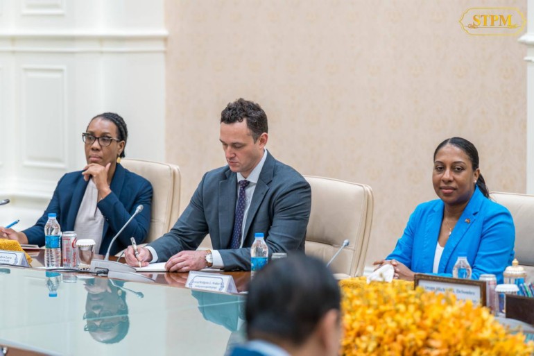 ​ឆ្លៀត​ក្នុង​ឱកាស​នោះដែរ​, សម្ដេច​បវរ​ធិបតី​ក៏​បាន​បញ្ជាក់​ជូន​គណៈប្រតិភូ​សហរដ្ឋ​អាមេរិក​អំពី​ការវាយតម្លៃ​ខ្ពស់ និង​អរគុណ​យ៉ាង​ជ្រាលជ្រៅ​ដល់​សហរដ្ឋ​អា​មរិក ជាពិសេស ឯកឧត្តម​ប្រធានាធិបតី Donald J. Trump ដែល​ខិតខំ​ស្វះស្វែង​បង្កើតឱ្យមាន​កិច្ចព្រមព្រៀង​ឈប់​បាញ់​កម្ពុជា​-​ថៃ នៅ​ថ្ងៃ​ទី​២៨ ខែកក្កដា និង​សេចក្ដីថ្លែងការណ៍​រួម​ទីក្រុង​គូ​ឡា​ឡាំ​ពួ​។ ជាមួយនឹង​ការពេញចិត្ត និង​ការថ្លែងអំណរគុណ​យ៉ាង​ជ្រាលជ្រៅ​របស់​ប្រជាជន​កម្ពុជា​ចំពោះ​ឯកឧត្តម​ប្រធានាធិបតី Donald J. Trump, កម្ពុជា បាន​គាំទ្រ​បេក្ខភាព​ឯកឧត្តម​ប្រធានាធិបតី សម្រាប់​ពានរង្វាន់​ណូបែល​សន្តិភាព​៕