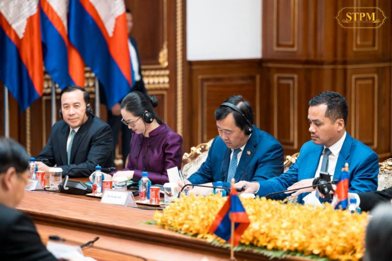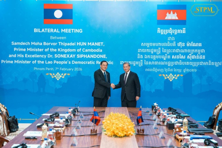 នារសៀលថ្ងៃទី០៧ ខែកុម្ភៈ ឆ្នាំ២០២៦, សម្តេចមហាបវរធិបតី ហ៊ុន ម៉ាណែត នាយករដ្ឋមន្ត្រី នៃព្រះរាជាណាចក្រកម្ពុជា បានទទួលជួបពិភាក្សាការងារជាមួយ ឯកឧត្តម សនសៃ ស៊ីផាន់ដន (Sonexay Siphandone) នាយករដ្ឋមន្ត្រីនៃសាធារណរដ្ឋប្រជាធិបតេយ្យប្រជាមានិតឡាវ នៅវិមានសាមគ្គីភាព ក្នុងឱកាសដែលឯកឧត្តមនាយករដ្ឋមន្ត្រីឡាវអញ្ជើញចូលរួមកិច្ចប្រជុំរវាងថ្នាក់ដឹកនាំកំពូលគណបក្សប្រជាជនកម្ពុជា, ថ្នាក់ដឹកនាំកំពូលគណបក្សកុម្មុយនីស្តវៀតណាម និងថ្នាក់ដឹកនាំកំពូលគណបក្សប្រជាជនបដិវត្តន៍ឡាវ នៅរាជធានីភ្នំពេញ ព្រះរាជាណាចក្រកម្ពុជា ពីថ្ងៃទី៦ដល់ថ្ងៃទី៧ ខែកុម្ភៈ ឆ្នាំ២០២៦។